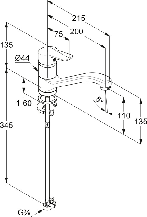 schwenkbarer Rohrauslauf, flexible Anschlussschläuche G 3/8“, Ausladung 200 mm
